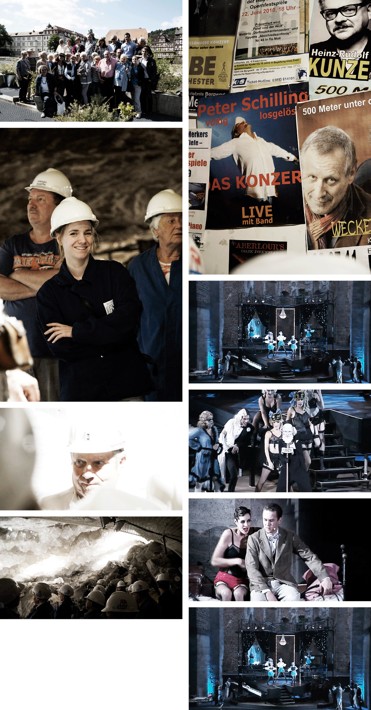 Die Schauspielabende wurden - wie immer - durch ein umfangreiches Rahmenprogramm ergänzt, bei dem die Theaterfreunde auf industriekulturellen und geschichtsträchtigen Spuren wandelten. Einen faszinierenden und bleibenden Eindruck hat der Nachmittag 800 m unter Tage im Kali-Bergwerk Merkers hinterlassen: Die Besichtigung des legendären Goldraumes (als geplantes Versteck des Reichsbank-Schatzes), die Kristallgrotte mit den größten bekannten Salzkristallen und die tiefste Bar Europas sind hier nur exemplarisch zu nennen. Dass die Dortmunder textsicher das „Steigerlied“ mitsingen konnten, muss hier wohl nicht besonders erwähnt werden.